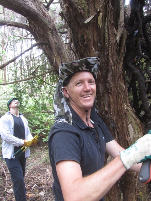 At one point, the team traced back some vines to a big plant growing deep in the bush that was threatening an old totara tree. They found a way in and worked together to remove it.