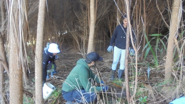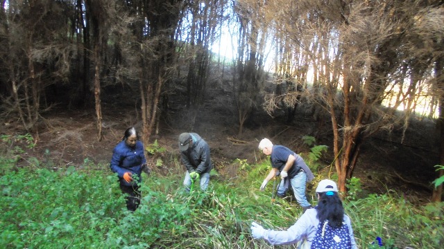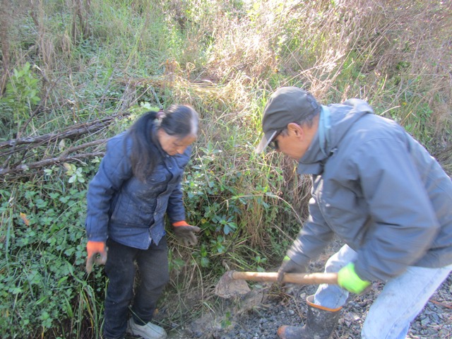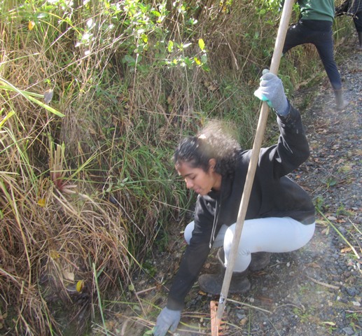 The group then broke up into teams, spread out throughout the planting site and went to work. One team tackled an open area that had a lot of weeds that they cleared before starting the planting.
