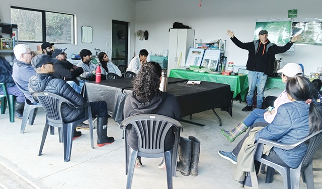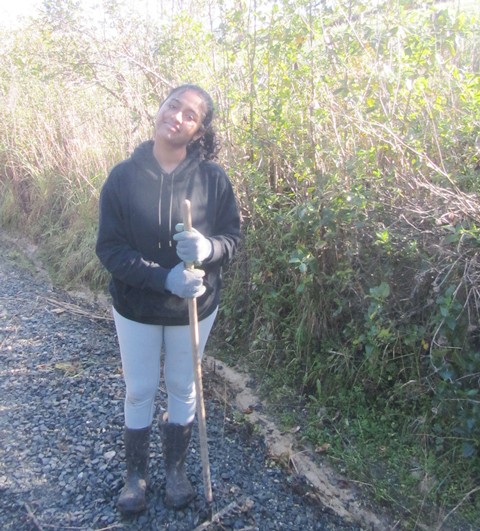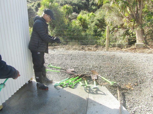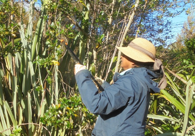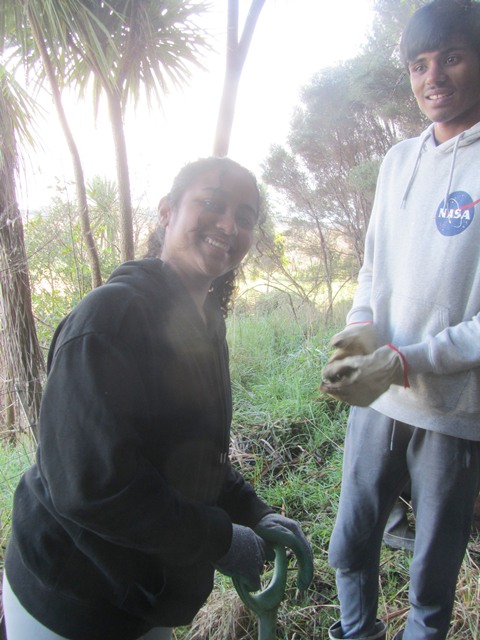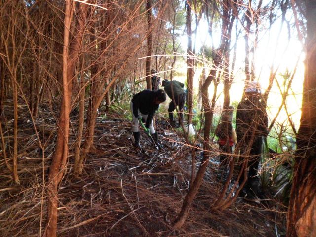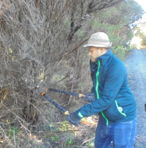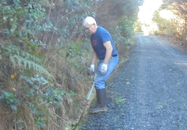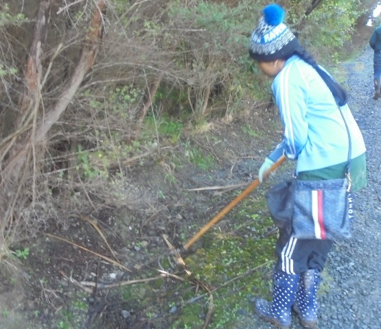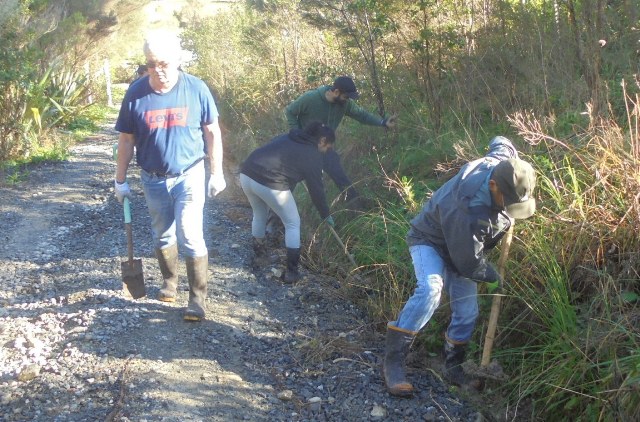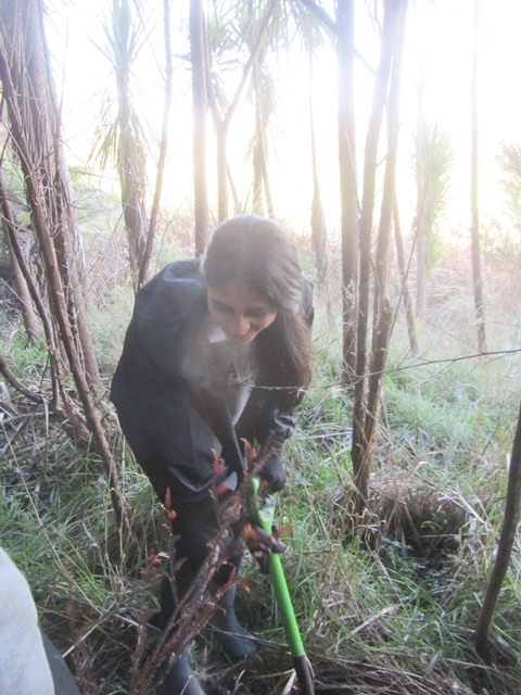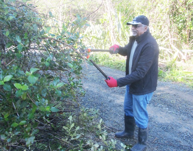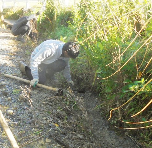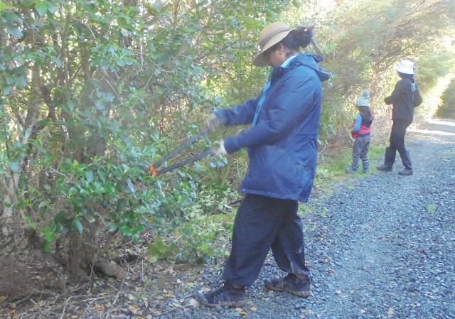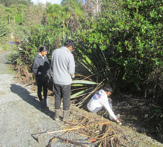 After the planting we still had time until lunch so we request the group assist with other tasks. The group broke into two teams – one team worked on helping to clear the drains along the main race to ensure that they aren’t blocked and ready for heavy winter rains and the other worked on trimming vegetation that had grown out over the track. The teams swapped the spades for rakes and loppers.