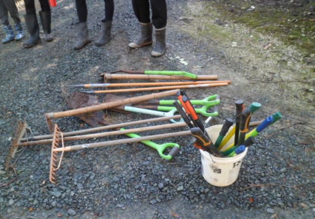 They then gathered up all of the spades and empty pots and trays to take back down.