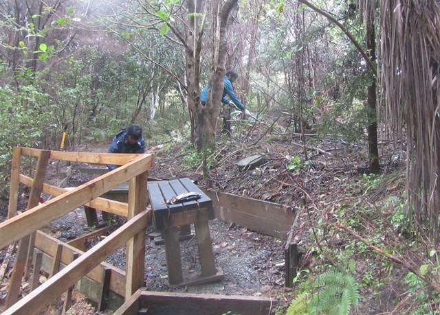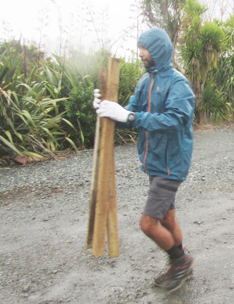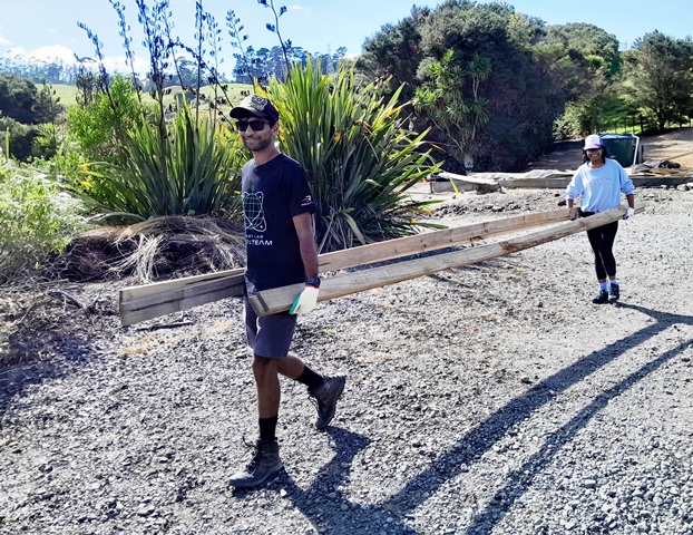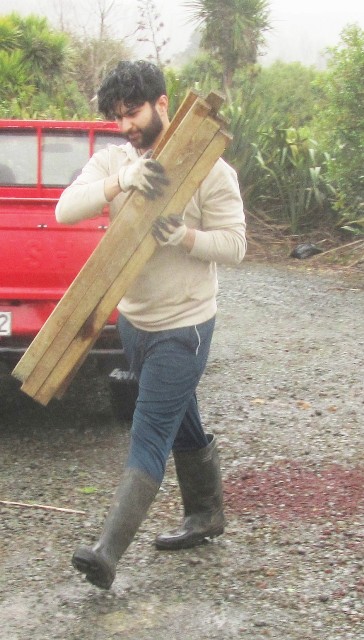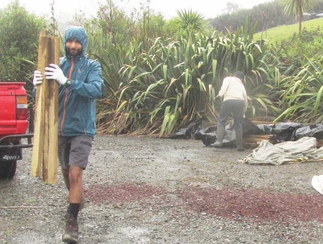 Over the past few months, we’ve been working on renovating the old milking shed/nursery into a secure storage area. The work is wrapping up and the first task we requested the team to tackle was to help carry the timber we use to build walking tracks and benches from the car park where it had been stored into the new shed.