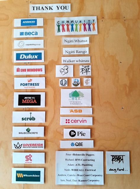 Massive thanks to the organisations and companies who also assisted our fundraising and gave grants or donated products or provided pro bono services–ASB Community Fund, Beca, Capability Group, Cervin, Dulux, Fortress, The Jenkins Foundation, Pie, QBE, Scrub, Sovereign Doors, and Wharehine.