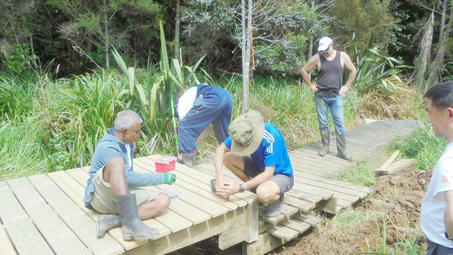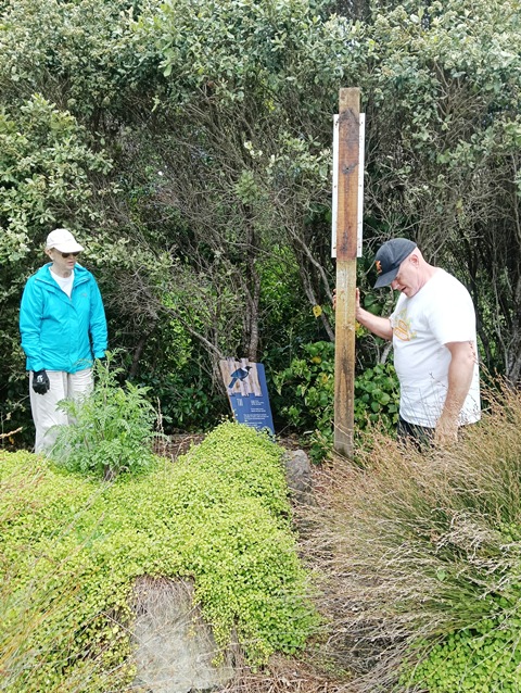Throughout the CUE Haven reserve there are a number of signs with information about birds, plants and animals, as well as directional and inspirational signs. Many years ago we had installed a sign about the tui bird near the cottage because there is a lot of harakeke and tuis flock to the flowers in summer. The flaxes have grown up and are obscuring the sign and we requested the boardwalk trimming team to help relocate it to a more visible site.