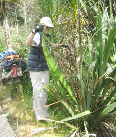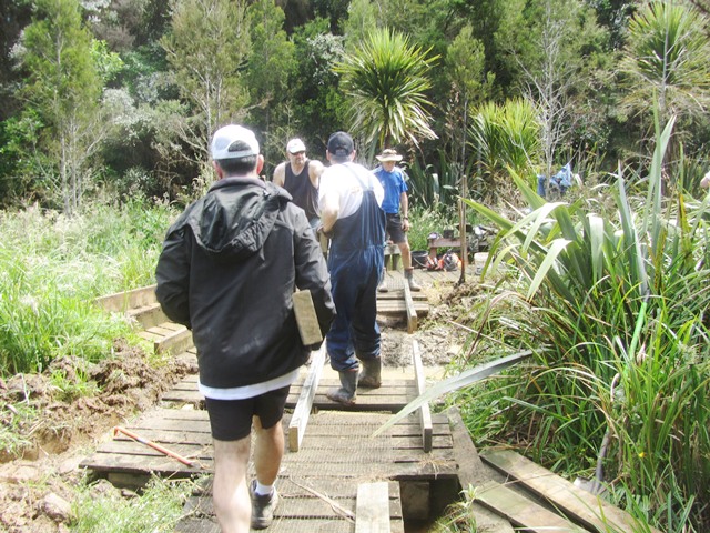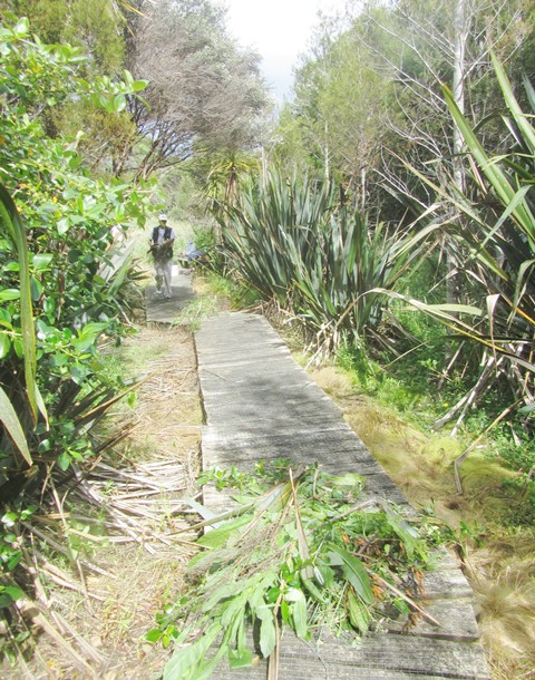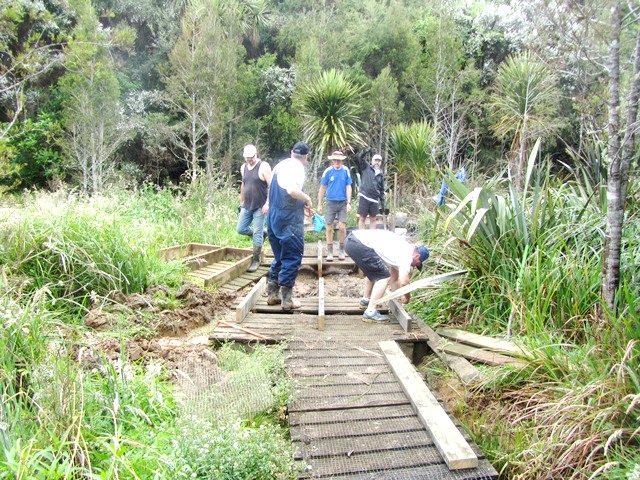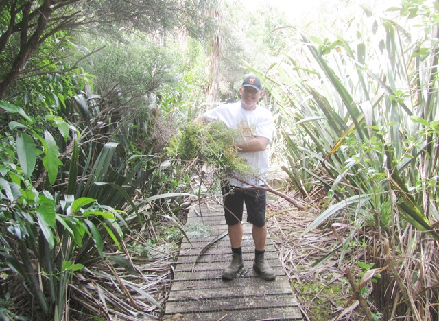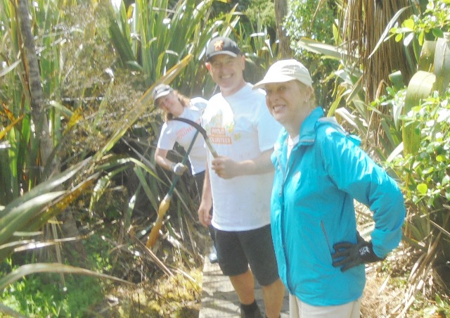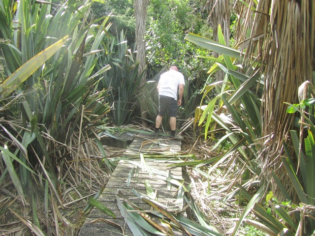 Another team went to work clearing up the rest of the boardwalk. In addition to vegetation washed over the surface by the diverted stream, a lot of flax and other wetland plants had grown over the boardwalk. The team went to work with loppers, secateurs and flax cutters and cleared the entire boardwalk.