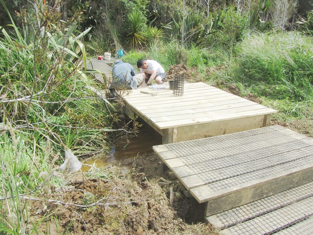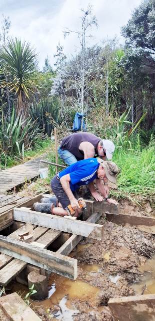 One of the biggest weather issues we’ve been dealing with is with the stream at the junction of the Taraire and the Titoki tracks. In 2015 we built a bridge over what at that point was a quiet and narrow section of the stream. The behaviour of the stream has changed due to the amount of water coming down the catchment and the channel has gotten wider since the 2023 Auckland Anniversary Day storms. Then last winter, the bridge collapsed because the supports were undermined after another heavy rain storm. We relocated the bridge further upstream and did some remediation work on the affected area of the Titoki track, moving it farther back from the stream and installing a railing.