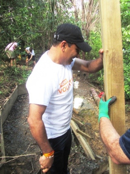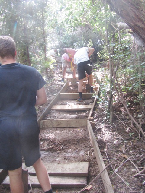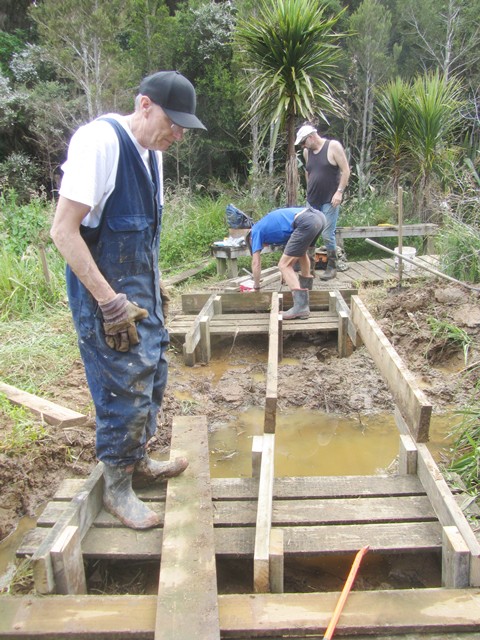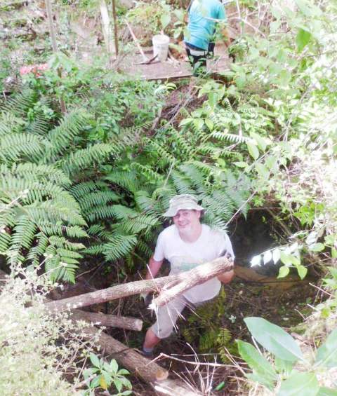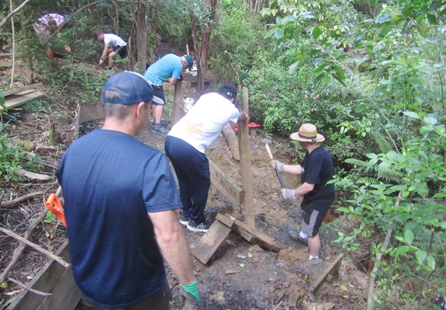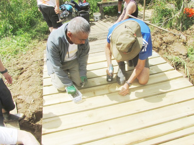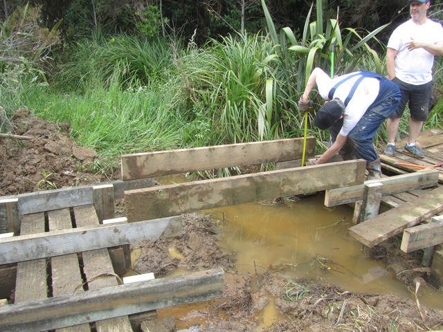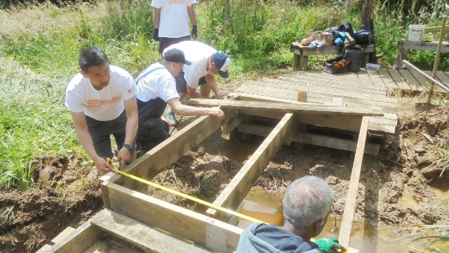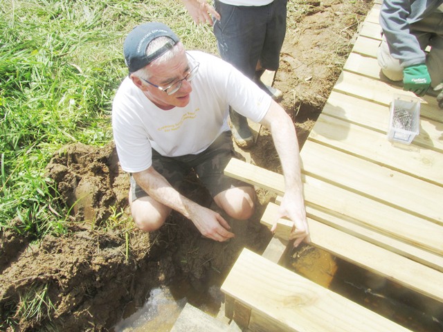 After lunch, a few others joined this team to finish off the bridge. Once the new framework was secured, they could measure and cut the top boards.