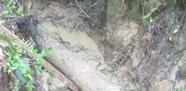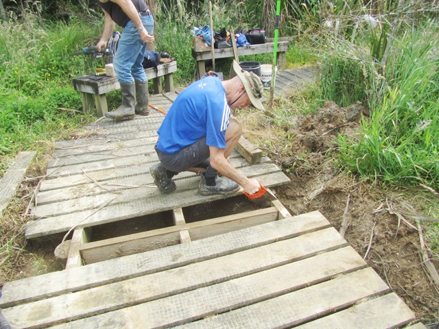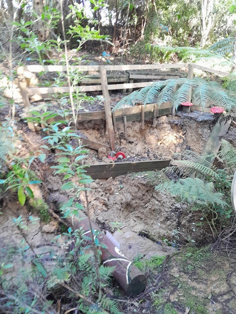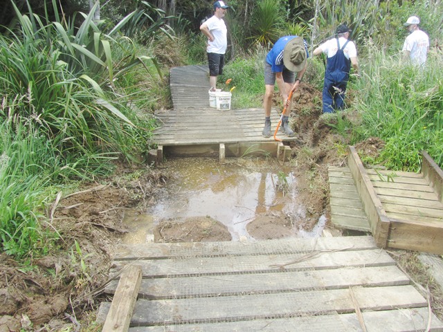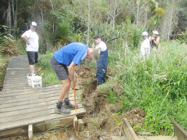 The boardwalk in the wetlands crosses the stream at two points and in 2014 when the boardwalk was built, we constructed bridges over both those sections. After the heavy rain events we’ve had, silt coming down from the farms upstream has clogged the area under the bridge. The result is that the stream has found a new course along the side of the boardwalk. Aside from impacting the wetlands further downstream this also has the effect of undermining the boardwalk as the stream flows along the support structure.