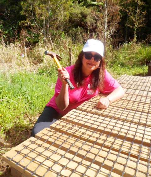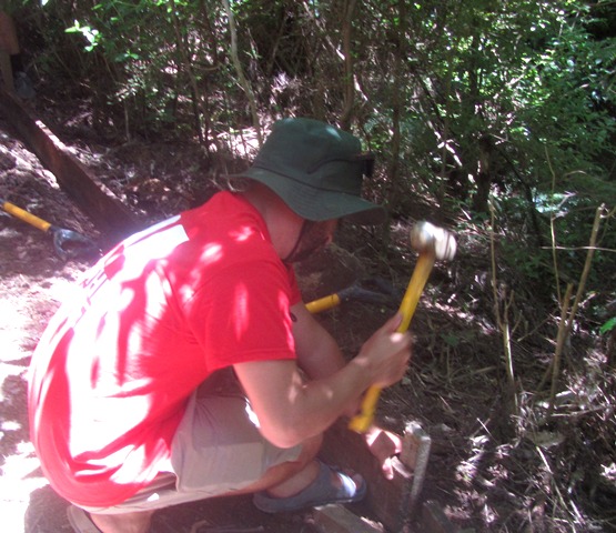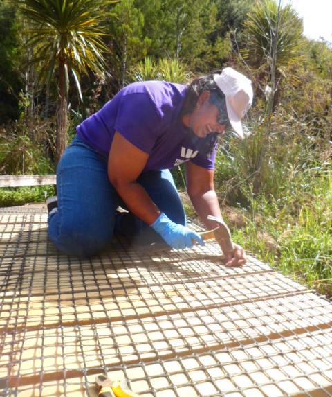 The team also installed mesh over the boards on a bridge that had recently been installed. The mesh will provide good traction. The team cut the mesh to size and nailed it in place.