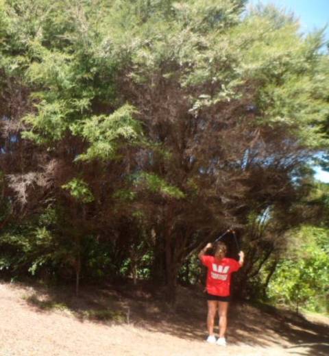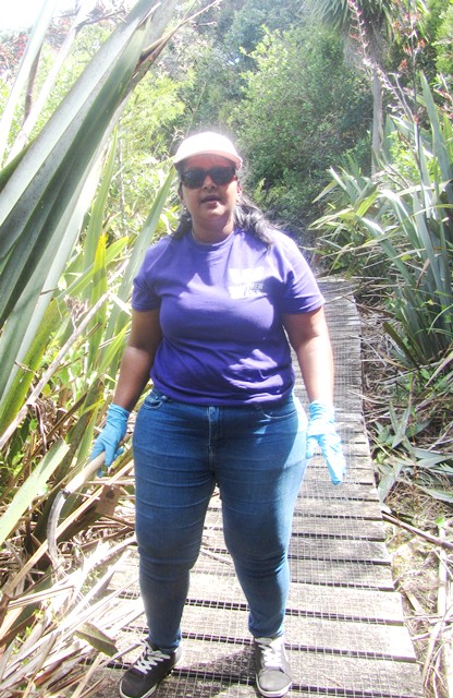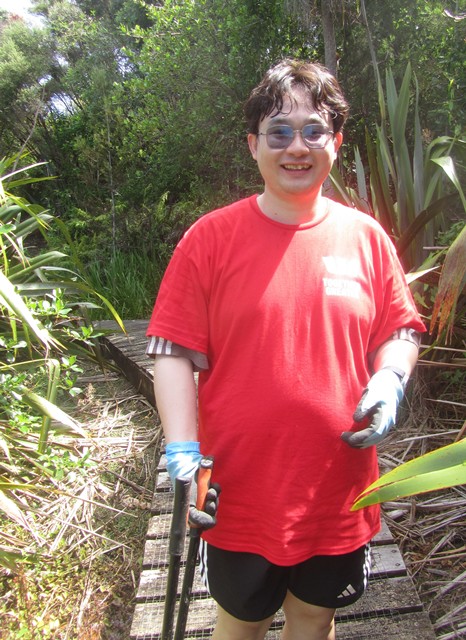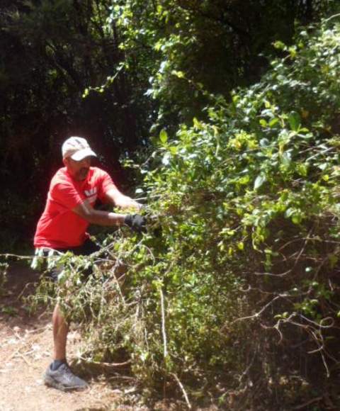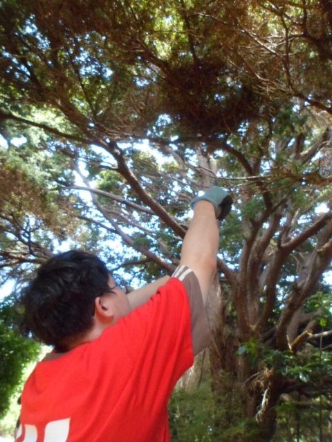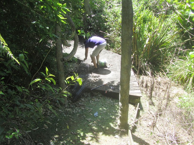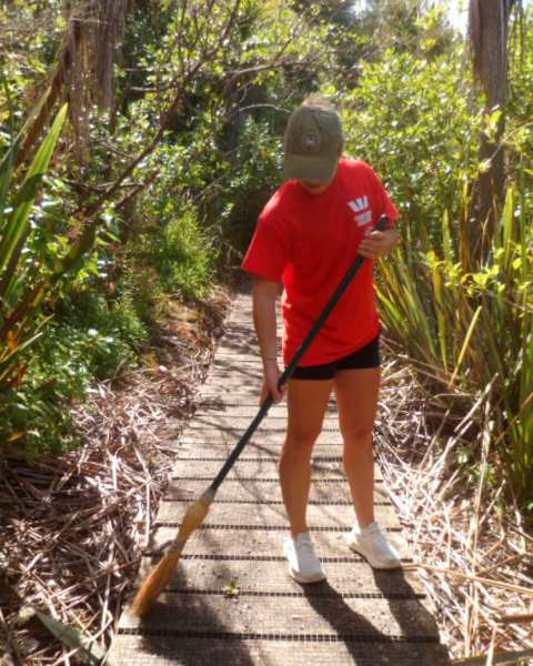 Once the boardwalk work was finished, the team moved up to the top of the property and worked on trimming vegetation growing over the roads. One of the challenges the team faced was clearing muehlenbeckia australis that was growing over trees in some areas. The meulenbeckia is a native vine that grows up along the edges of regenerating forests and unless it is controlled, it will completely cover and kill small trees.