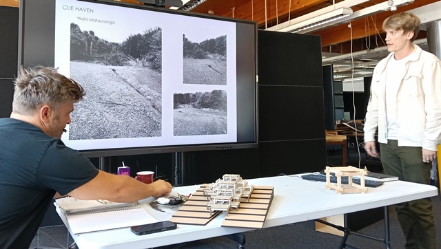 Matt Liggins, Professional Teaching Fellow with Te Pare School of Architecture and Planning at the University of Auckland brought his fourth year architecture students to CUE Haven for an assignment to design site-specific benches that blend into the surrounding landscape and use sustainable but durable materials.