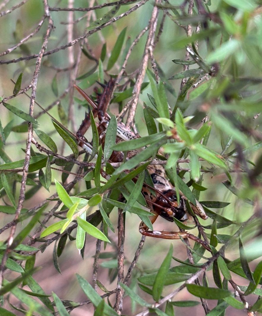 The team were delighted to spot a tree weta in a manuka tree. This was a very unusual sight as tree weta are nocturnal and it was quite likely that the weta was disturbed by the trimming from the tree cavity it was nesting in.