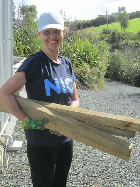 The plan was to first build a framework which would be secured into the ground and then to nail on the top boards. The team brought up the timber they would need and then measured and cut the first side board.